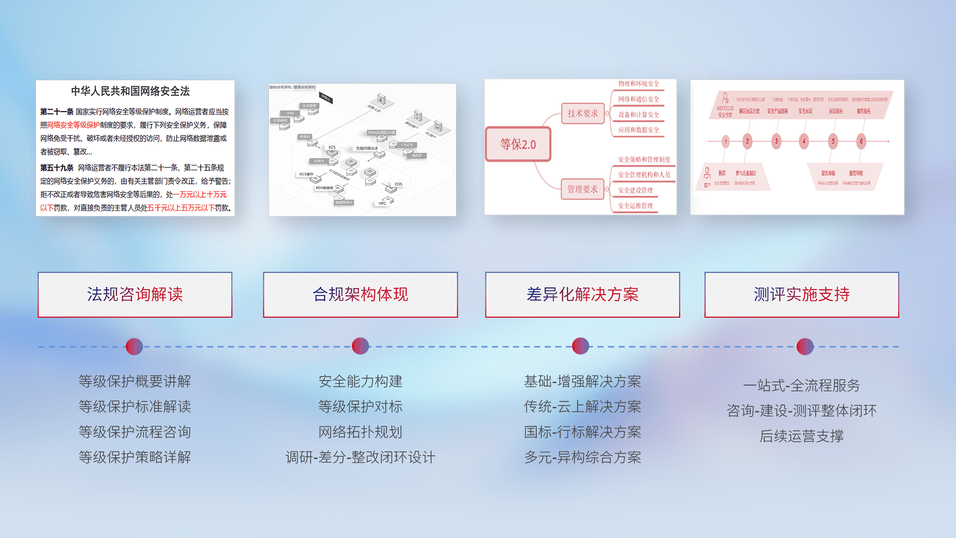 通过专业的法律咨询解读、、合规架构体现、、、、差异化解决方案、、、测试实施支持等服务,,为客户量身打造等保合规体系。。。。