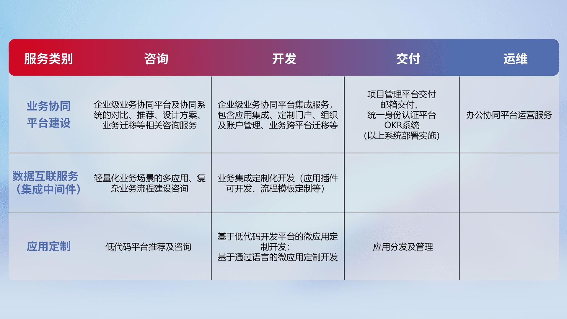 针对钉钉、、、、企微、、、IDaas等平台级产品提供产品的规划、、、、方案、、、交付、、、定制化开发等服务,,,,实现如统一协同办公、、、智能客户服务、、、混合会议管理、、智能数据查询、、、、等业务场景,,,实现数字化转型。。。